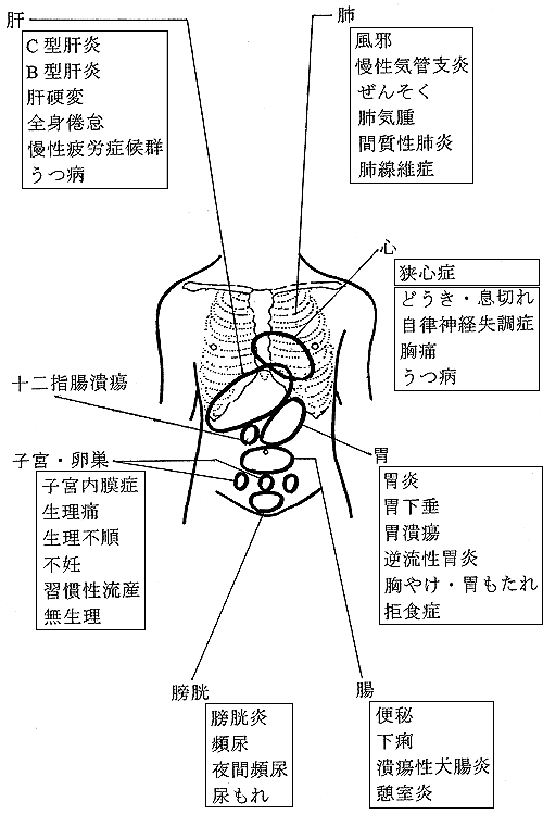 内臓疾患下記よりお悩みの箇所をクリックしてください。福西佐元院長が書いた解説記事をご覧になることが出来ます。 ここで大切なことは、東洋医学(お灸と指圧)にあっては、西洋医学と異なり、病名または症状ごとに治療法が基本的に同じだということです。例えば、腸の疾患について考えるなら、便秘と下痢では、西洋医学にあっては全く治療法が違います。しかし、東洋医学にあっては、同じ場所に同じようにお灸や指圧をすえるのです。すると、便秘は解消し、下痢はとまるのです。これはお灸や指圧が自律神経を刺激し、それが自律神経の自動調節作用を起こさせるからです。 以下は、鍼灸院を訪れる人が訴える病名や症状を列挙したものです。 ![]()